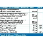 AGENT DE CHARGE : CELLULOSE MICROCRISTALLINE ; CYRACOS® : EXTRAIT DE MELISSE; EXTRAIT DE GRIFFONIA SIMPLICIFOLIA TITRE A 20% DE L-5-HTP ; OXYDE DE MAGNESIUM ; EXTRAIT DE PAVOT DE CALIFORNIE ; ANTI AGGLOMERANT : CARBONATE DE MAGNESIUM, STEARATE DE MAGNESIUM ; VITAMINE B3 ; MELATONINE ; VITAMINE B6.